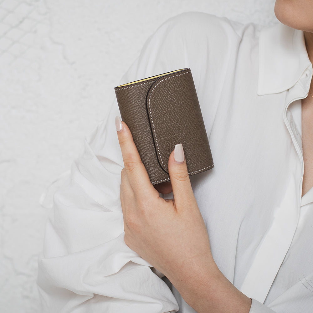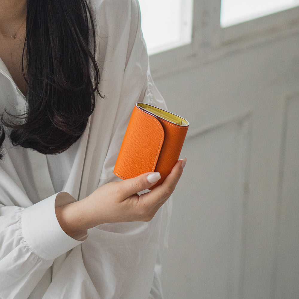 やわらかくしっとりした触り心地が特徴の高級レザー「ワープロラックス」を使用しました。使い込むうちに光沢感が増すため、経年変化が楽しめるミニ財布です