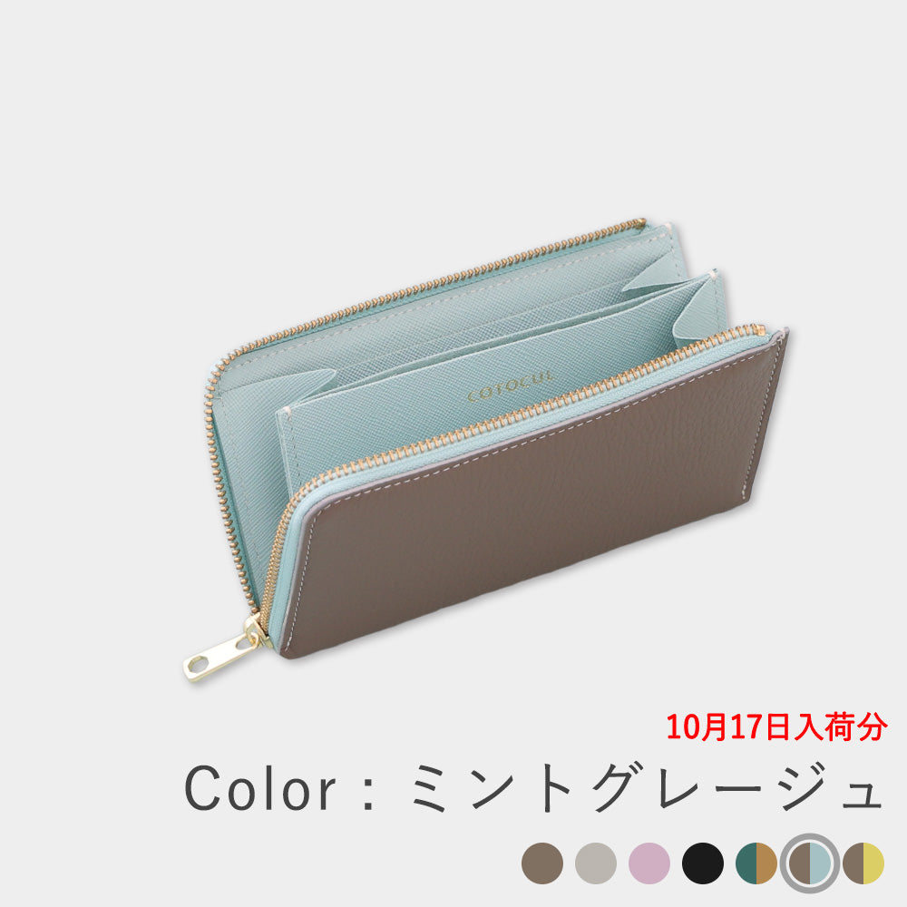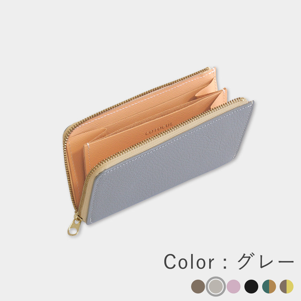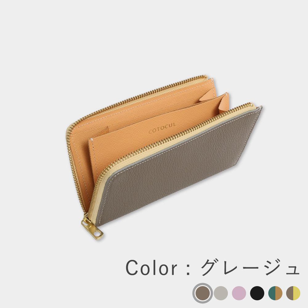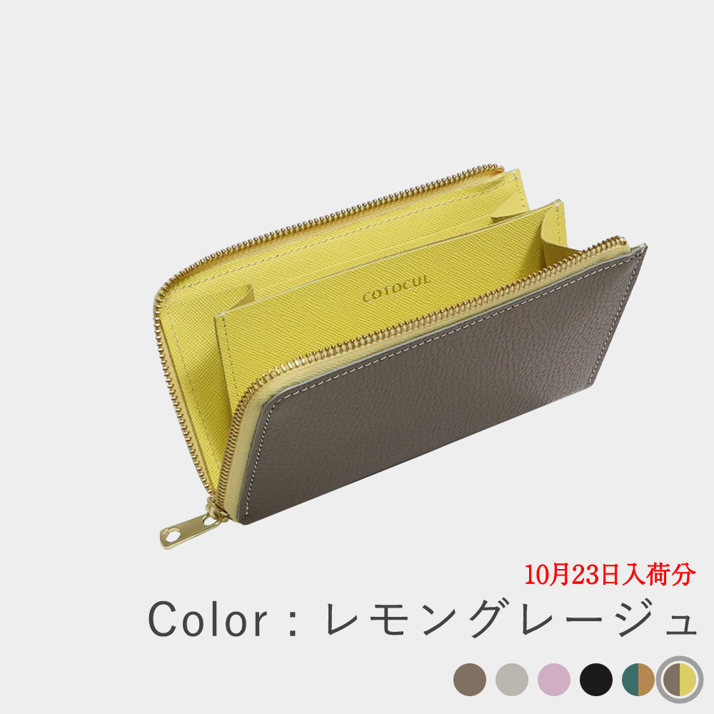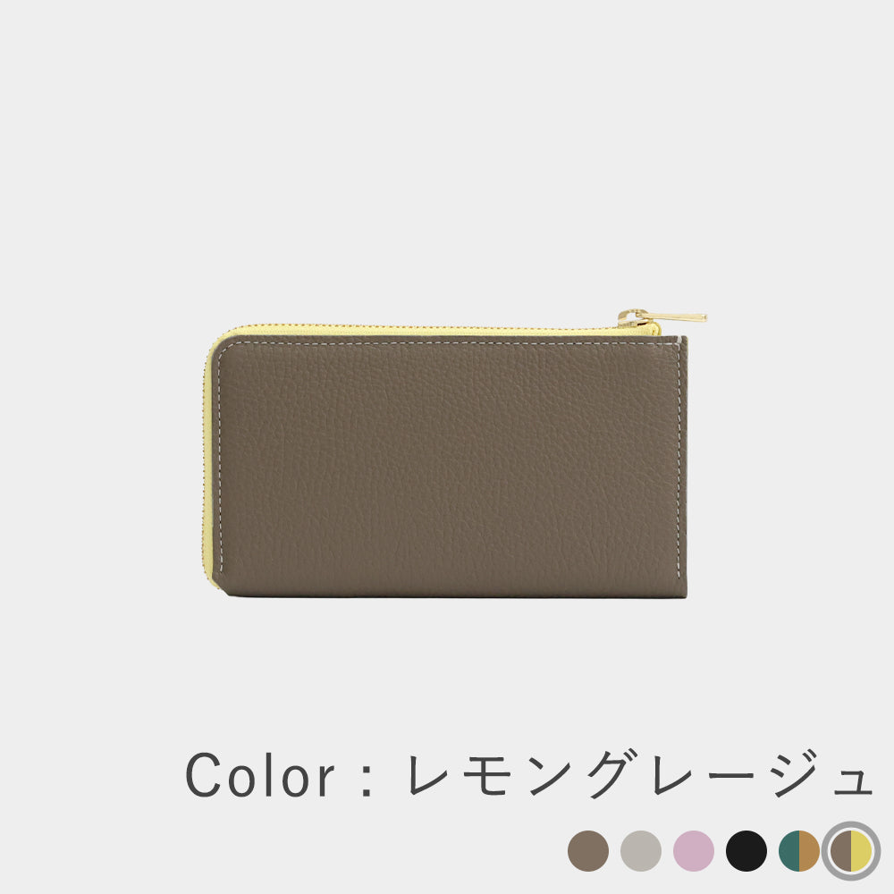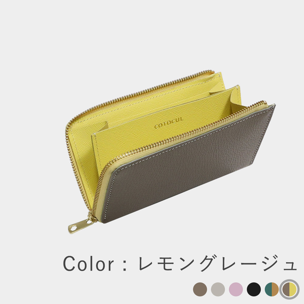 外側はどんなファッションにも馴染むグレージュ、内側のレモンイエローは開けるたびに明るい気持ちにしてくれます